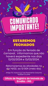 Comunicamos que na sexta-feira, dia 25/03/16, não haverá expediente, conforme art. 50, II, do Código de Normas da CGJMG.